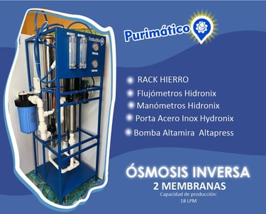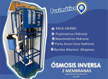 Rack fabricado en hierro. Porta membranas en acero inoxidable, medidores de flujo y manómetros Hydronix. Puede usarse de forma automática o manual. Bomba ALTAMIRA.